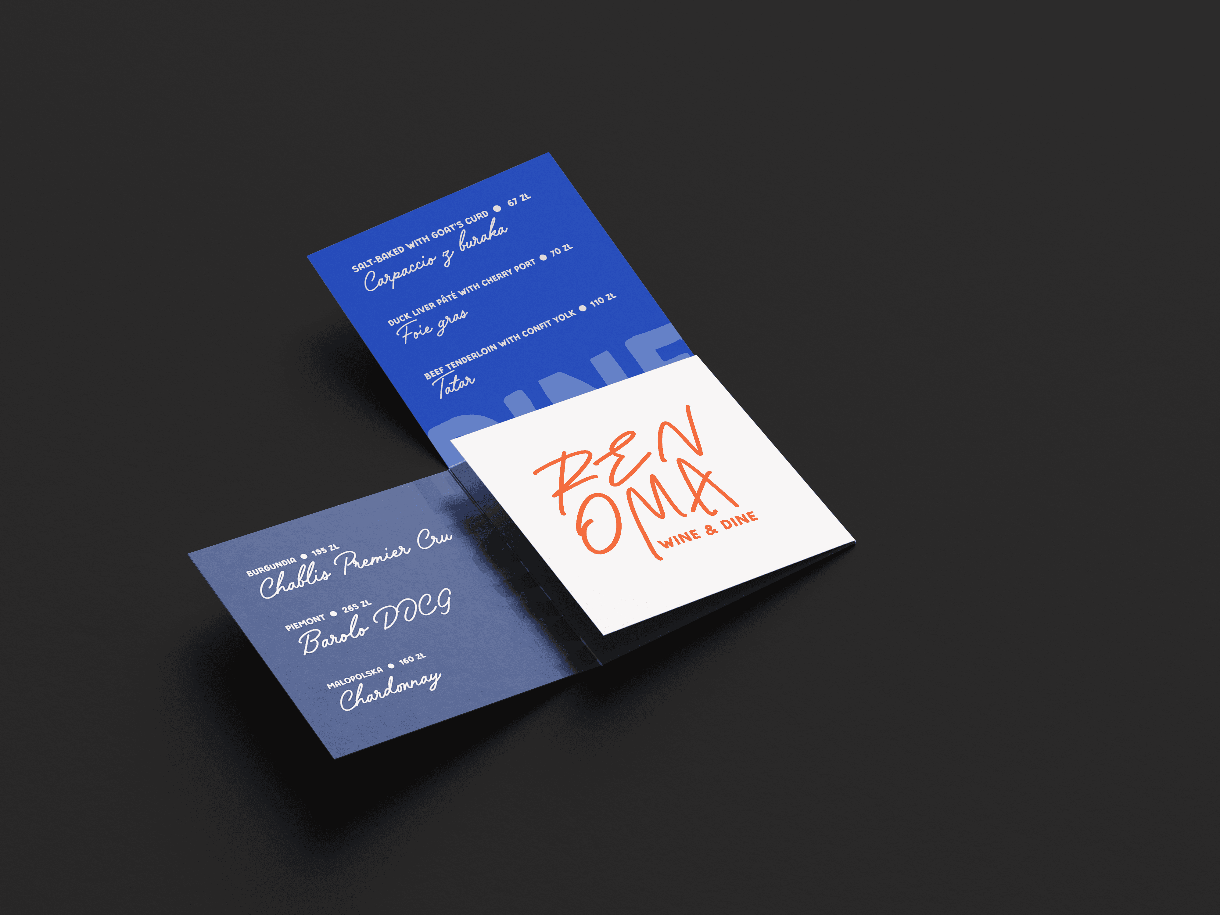 Renoma started as a name with weight. In Polish, renoma means reputation — the kind built slowly, earned through consistency, never announced. That tension between confidence and restraint became the brief: a restaurant that doesn't need to explain itself, only to be experienced. The identity leans on contrast as a system. Royal blue carries the interior — bold, almost institutional, the colour of old European dining rooms redrawn without nostalgia. Against it, the brushstroke logotype cuts loose: hand-drawn, kinetic, unapologetically alive.